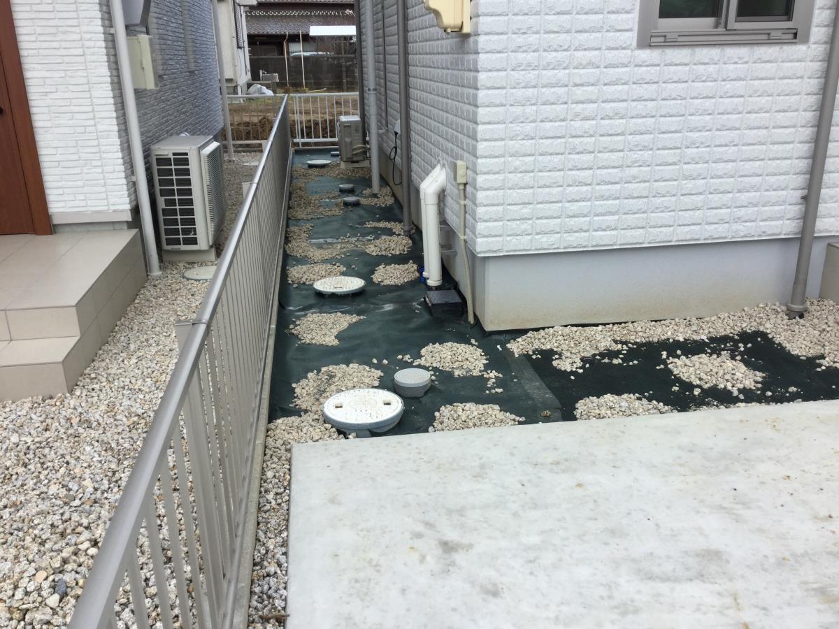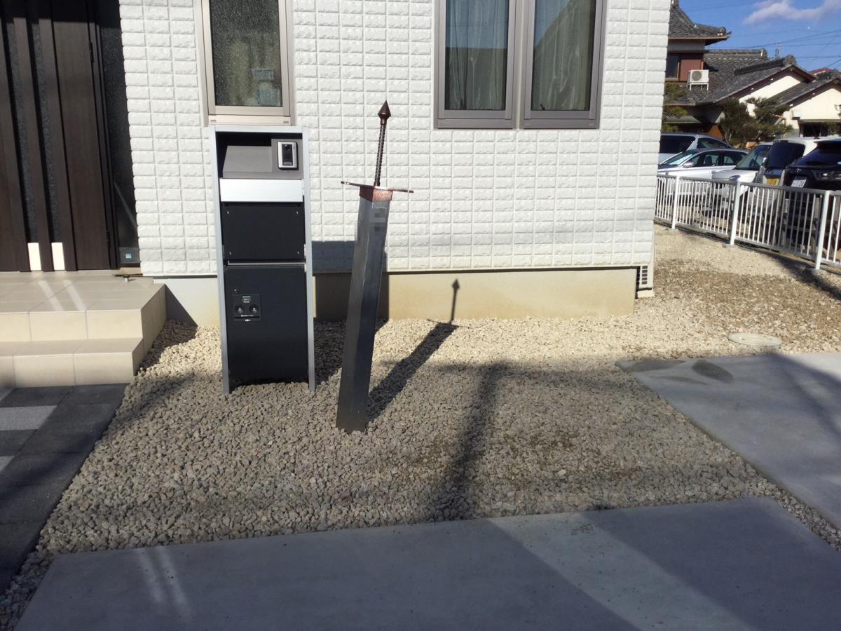 駐車スペースを広くとれて、インパクトのある玄関までのアプローチにこだわりました。 またお客様こだわりの表札も面白いです。 草が生えないように砂利部分には丁寧に防草シートを敷きました。